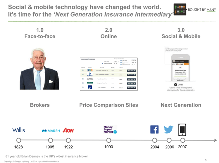 In our pitch deck for potential investors, we laid this story on with a trowel. We chose the UK’s oldest broker, 81 year-old Brian Denney, immaculately turned out with pocket square and blue silk tie, as the face of an industry that was long overdue disruption [4].